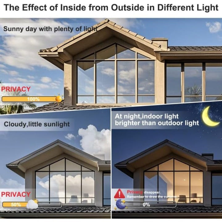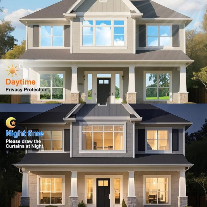 By day the outside sees a sleek mirror while you enjoy an un-tinted view. Tip: draw the curtains at night when indoor lights outshine the street.