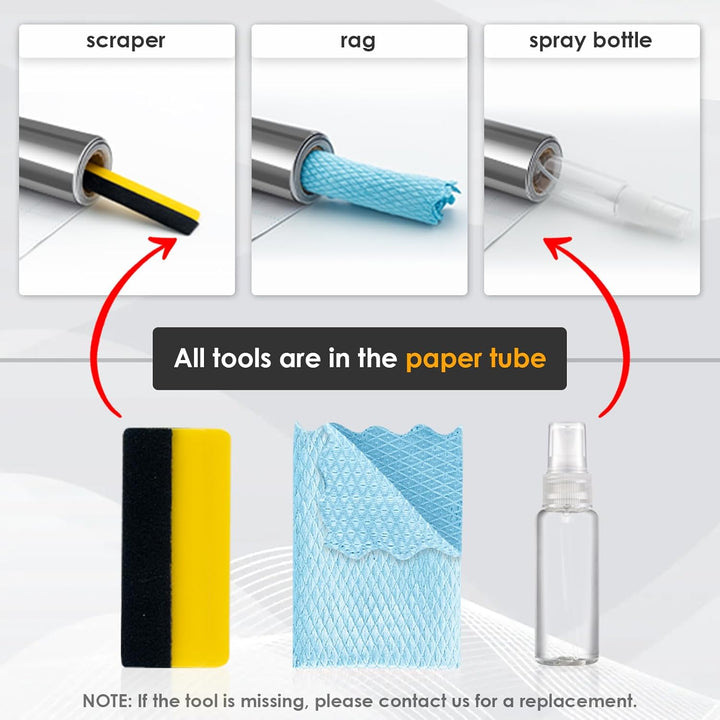 Each roll ships in a sturdy paper tube that hides a squeegee, microfiber rag and refillable spray bottle, so you can measure, mist and mount straight out of the box.