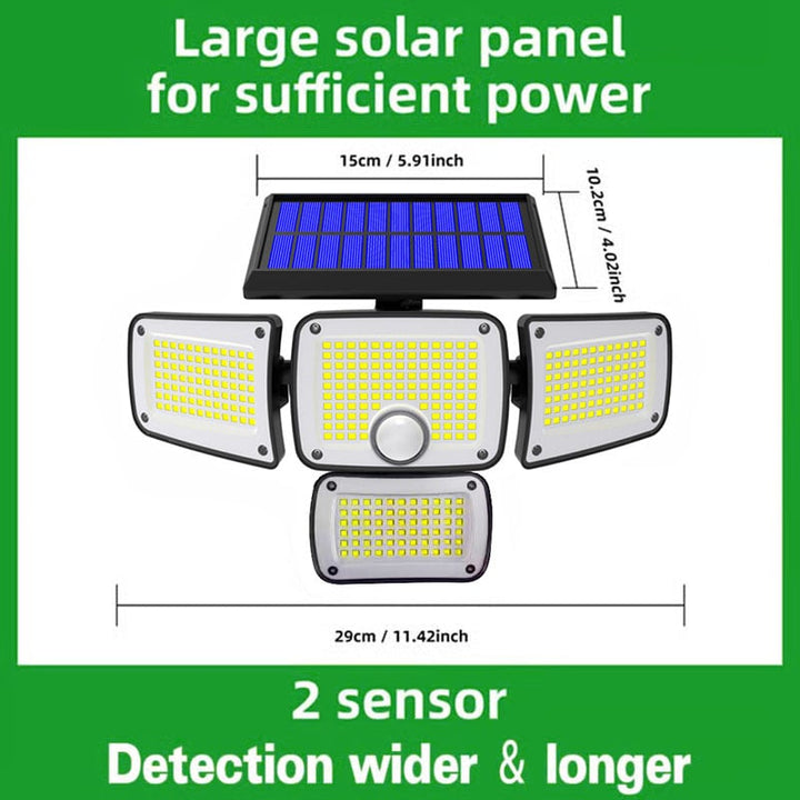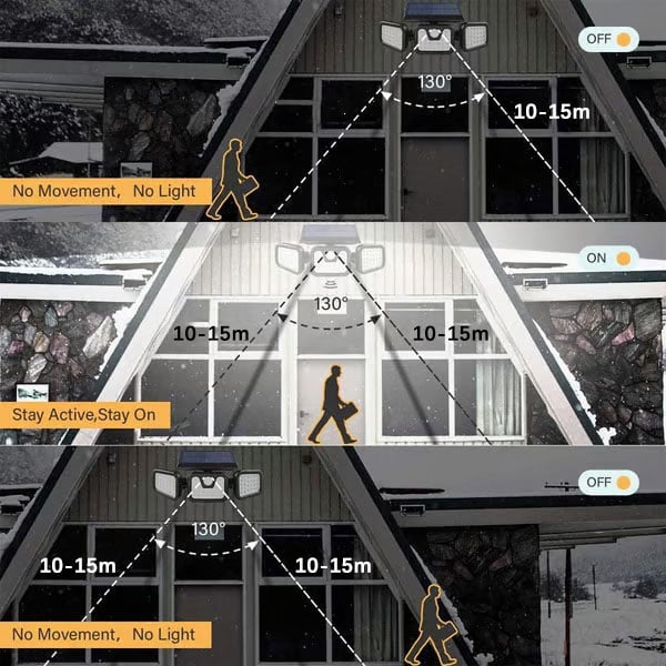With the innovative wide-angle and 3-headed design, adjustable heads can move upwards, downwards, and horizontally. Up to 270° wide lighting angle, easy to adjust the light heads, lens hoods, and motion sensor to different angles as your requirement, which can provide extra brightness and more visible area.